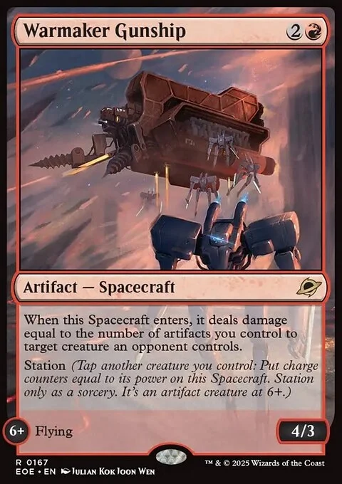 When this Spacecraft enters, it deals damage equal to the number of artifacts you control to target creature an opponent controls. Station (Tap another creature you control: Put charge counters equal to its power on this Spacecraft. Station only as a sorcery. It's an artifact creature at 6+.) STATION 6+ Flying