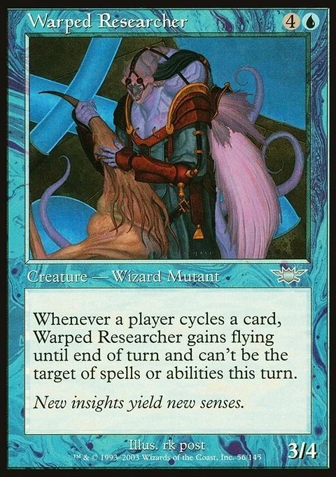 Whenever a player cycles a card, Warped Researcher gains flying until end of turn and can't be the target of spells or abilities this turn.