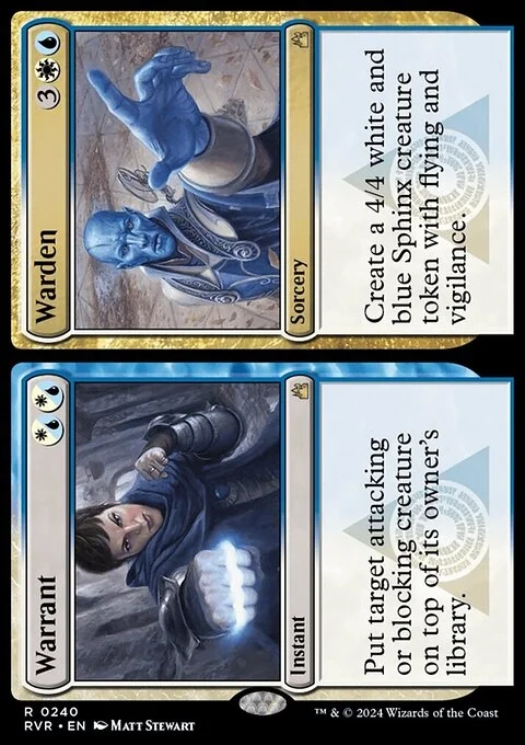 Warrant Put target attacking or blocking creature on top of its owner's library. Warden Create a 4/4 white and blue Sphinx creature token with flying and vigilance.