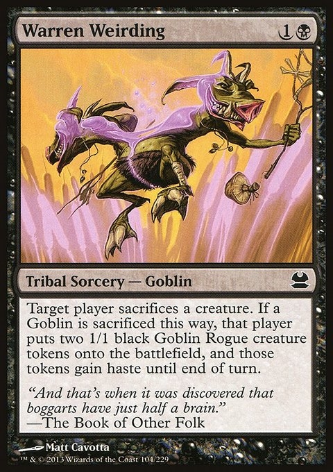 Target player sacrifices a creature. If a Goblin is sacrificed this way, that player creates two 1/1 black Goblin Rogue creature tokens, and those tokens gain haste until end of turn.