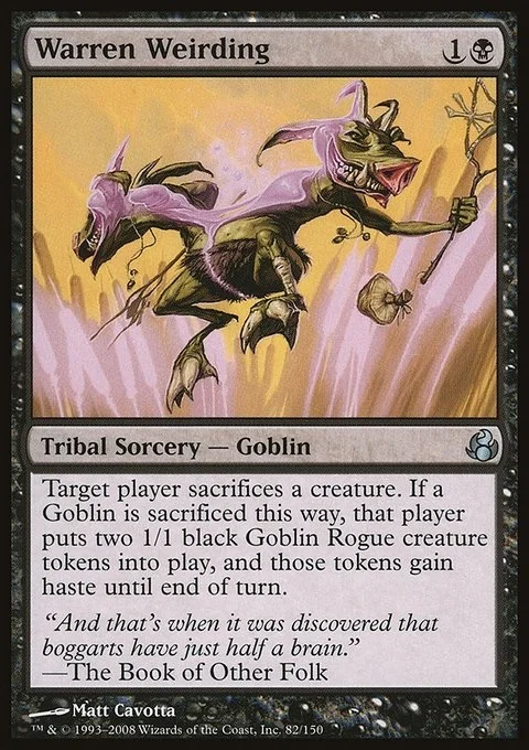 Target player sacrifices a creature. If a Goblin is sacrificed this way, that player puts two 1/1 black Goblin Rogue creature tokens into play, and those tokens gain haste until end of turn.
