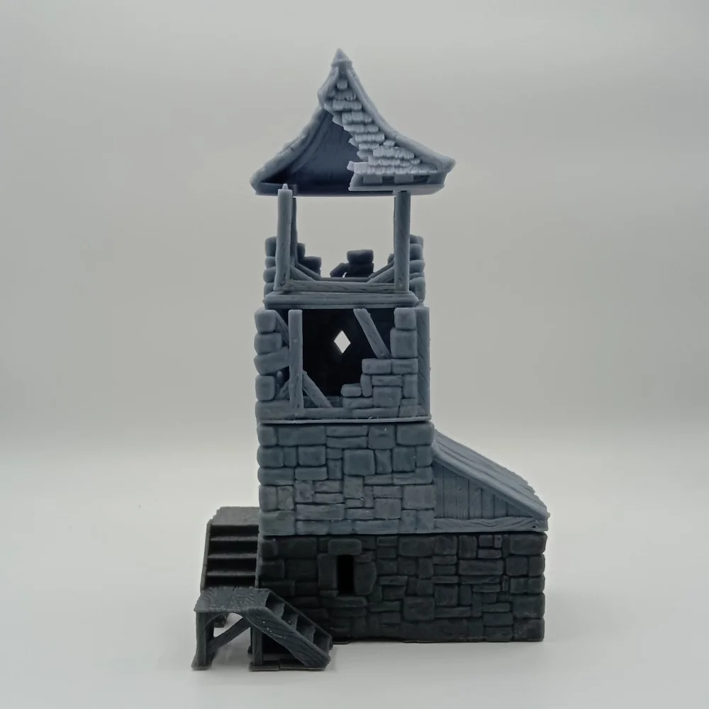 Size of base level with side room 50mm height by 155m width by 105mm depth. Size of level with side roof 50mm height by 130mm width by 80mm depth. Size of ruined level 50mm height by 80mm width by 80mm depth. Size of top ruined level 35mm height by 80mm width by 70mm depth. Size of ruined roof 70mm height by 90mm width by 90mm depth. Size of frame 45mm height by 60mm width by 60mm depth. Size of ladder 55mm height by 15mm width by 2mm depth. Size of trapdoors and floors 5mm height by 25mm width by 25mm depth. Total height 220mm.