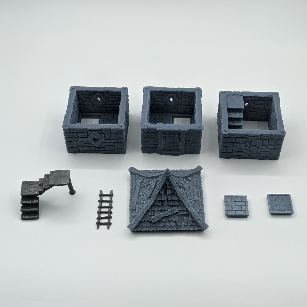 This is for 1 normal roof, 1 entrance level, 1 empty level, 1 floorless level with stairs, 1 broken roof, 1 ladder, 1 set of stairs (not attched to building), 1 wooden trapdoor and 1 stone trapdoor.