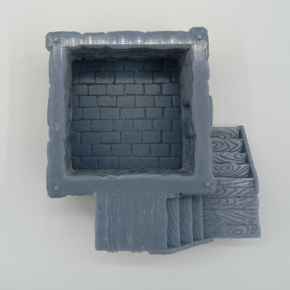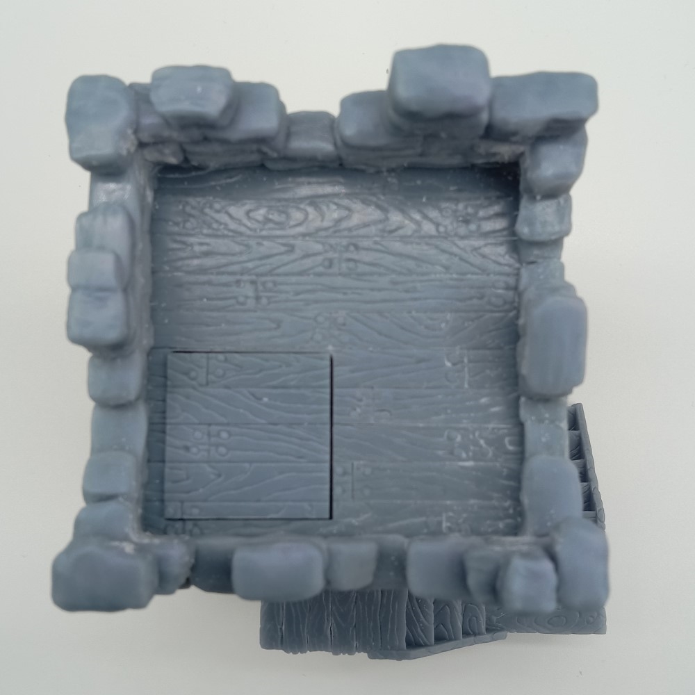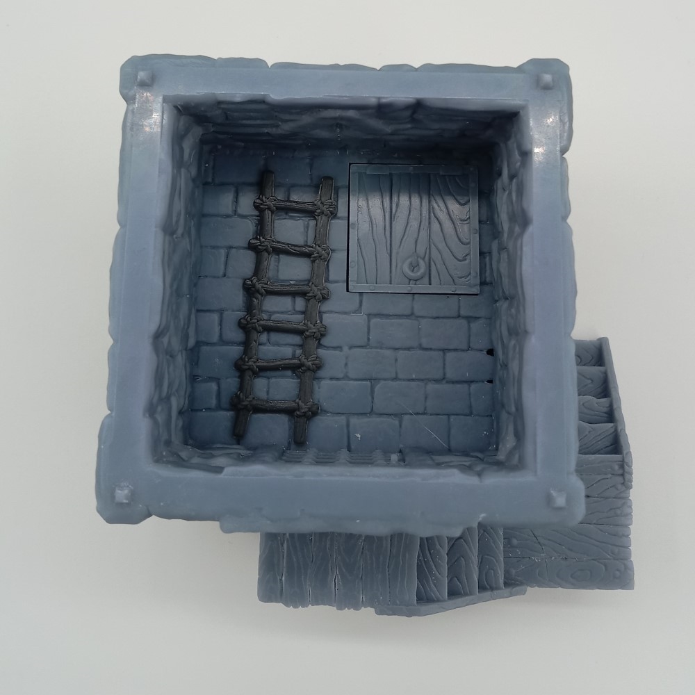 Size of Base level with outer stairs 50mm height by 105mm width by 105mm depth. Size of entrance level 50mm height by 80mm width by 80mm depth. Size of ruined level 40mm height by 80mm width by 80mm depth. Size of ladder 55mm height by 15mm width by 2mm depth. Size of trapdoors and floors 5mm height by 25mm width by 25mm depth.