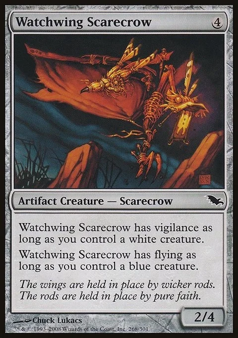 Watchwing Scarecrow has vigilance as long as you control a white creature. Watchwing Scarecrow has flying as long as you control a blue creature.