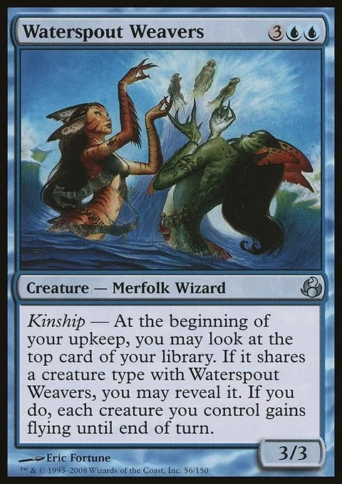 Kinship — At the beginning of your upkeep, you may look at the top card of your library. If it shares a creature type with Waterspout Weavers, you may reveal it. If you do, each creature you control gains flying until end of turn.