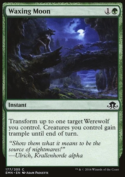Transform up to one target Werewolf you control. Creatures you control gain trample until end of turn.