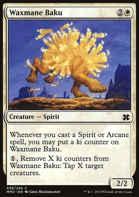 Whenever you cast a Spirit or Arcane spell, you may put a ki counter on Waxmane Baku. {1}, Remove X ki counters from Waxmane Baku: Tap X target creatures.