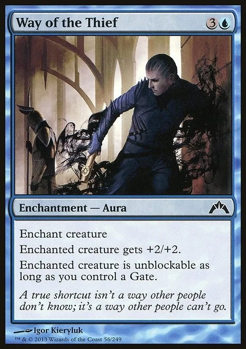 Enchant creature Enchanted creature gets +2/+2. Enchanted creature can't be blocked as long as you control a Gate.