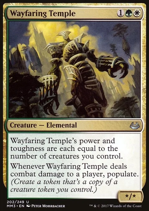 Wayfaring Temple's power and toughness are each equal to the number of creatures you control. Whenever Wayfaring Temple deals combat damage to a player, populate. (Create a token that's a copy of a creature token you control.)