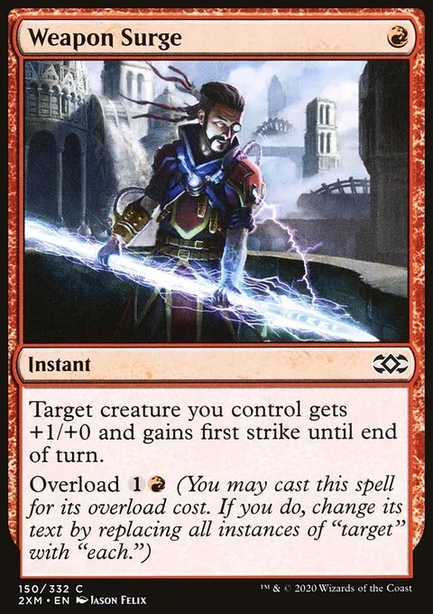 Target creature you control gets +1/+0 and gains first strike until end of turn. Overload {1}{R} (You may cast this spell for its overload cost. If you do, change its text by replacing all instances of "target" with "each.")