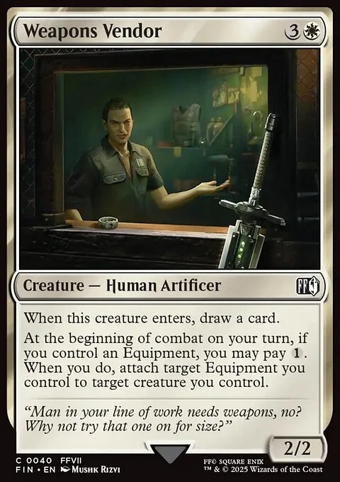 When this creature enters, draw a card. At the beginning of combat on your turn, if you control an Equipment, you may pay {1}. When you do, attach target Equipment you control to target creature you control.