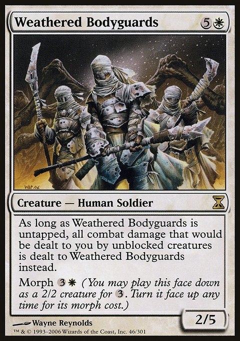 As long as Weathered Bodyguards is untapped, all combat damage that would be dealt to you by unblocked creatures is dealt to Weathered Bodyguards instead.