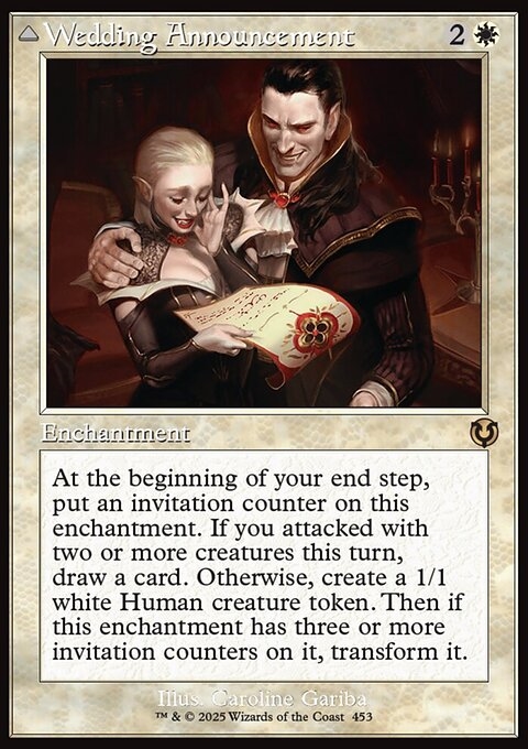 At the beginning of your end step, put an invitation counter on this enchantment. If you attacked with two or more creatures this turn, draw a card. Otherwise, create a 1/1 white Human creature token. Then if this enchantment has three or more invitation counters on it, transform it.