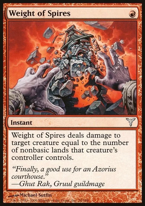 Weight of Spires deals damage to target creature equal to the number of nonbasic lands that creature's controller controls.