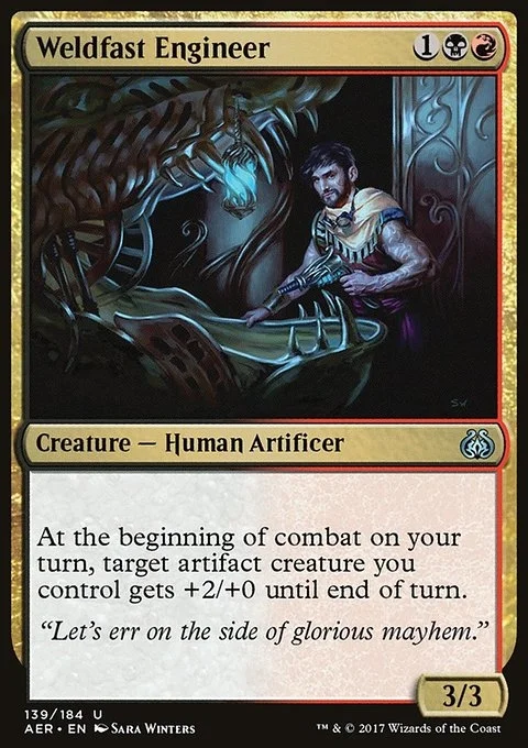 At the beginning of combat on your turn, target artifact creature you control gets +2/+0 until end of turn.