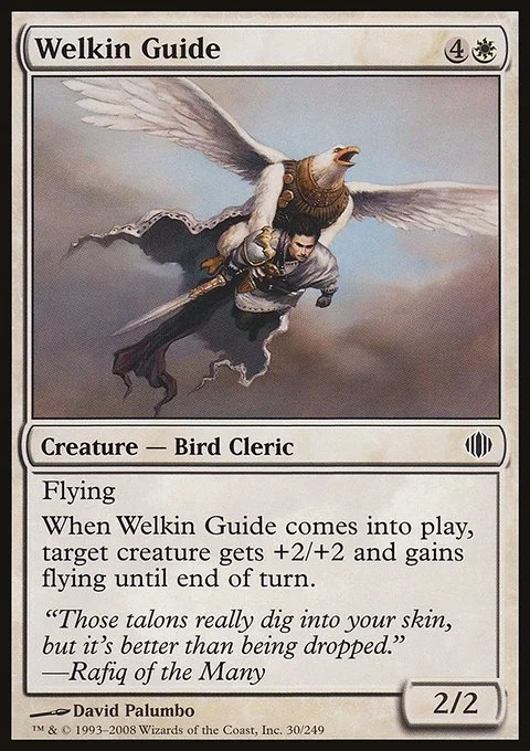 Flying When Welkin Guide enters, target creature gets +2/+2 and gains flying until end of turn.