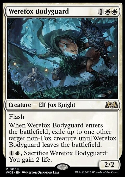 Flash When Werefox Bodyguard enters, exile up to one other target non-Fox creature until Werefox Bodyguard leaves the battlefield. {1}{W}, Sacrifice Werefox Bodyguard: You gain 2 life.