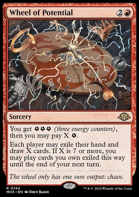You get {E}{E}{E} (three energy counters), then you may pay X {E}. Each player may exile their hand and draw X cards. If X is 7 or more, you may play cards you own exiled this way until the end of your next turn.