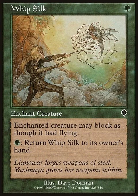 Enchant creature Enchanted creature has reach. (It can block creatures with flying.) {G}: Return Whip Silk to its owner's hand.