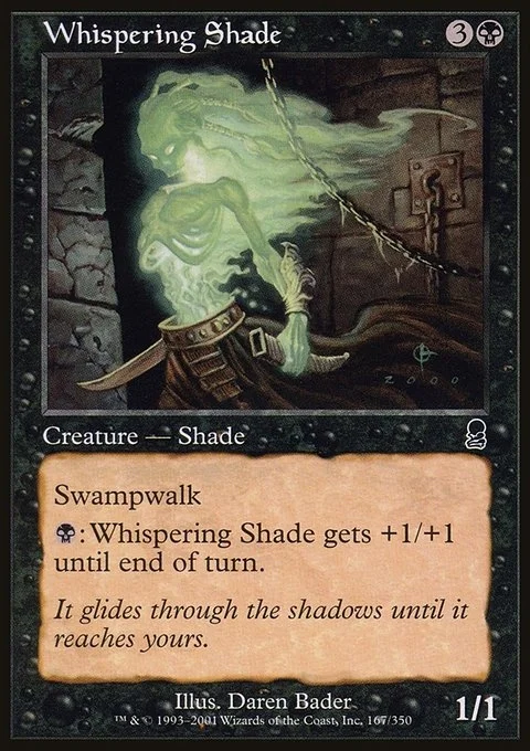 Swampwalk (This creature can't be blocked as long as defending player controls a Swamp.) {B}: Whispering Shade gets +1/+1 until end of turn.