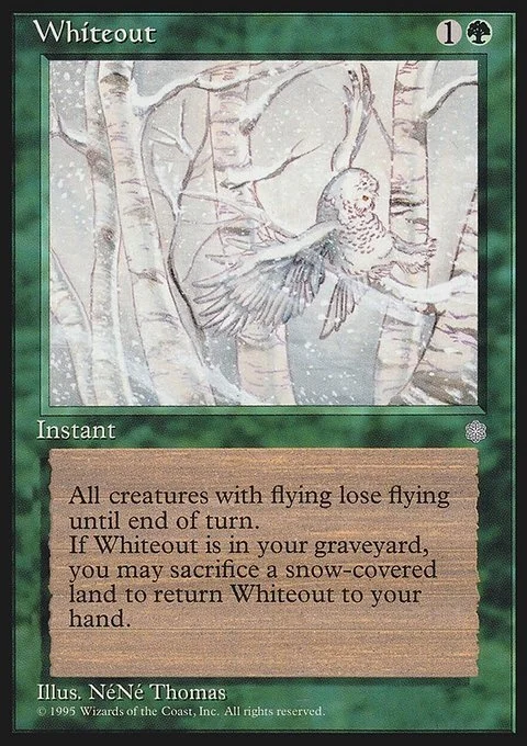 All creatures with flying lose flying until end of turn.If Whiteout is in your graveyard, you may sacrifice a snow-covered land to return Whiteout to your hand.