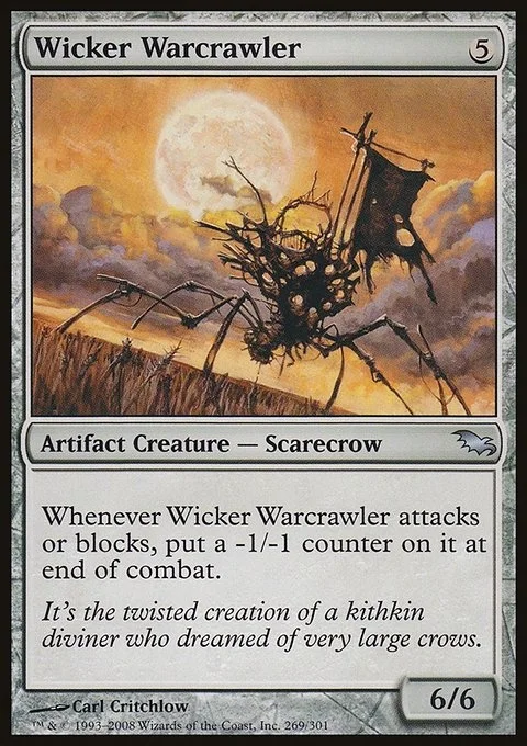 Whenever Wicker Warcrawler attacks or blocks, put a -1/-1 counter on it at end of combat.