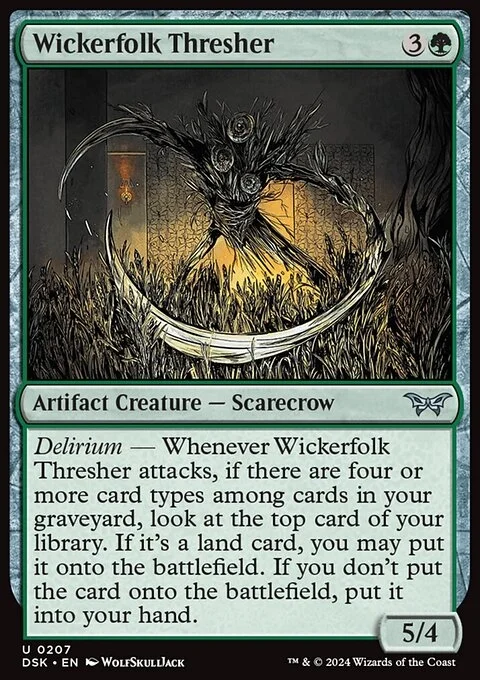 Delirium — Whenever this creature attacks, if there are four or more card types among cards in your graveyard, look at the top card of your library. If it's a land card, you may put it onto the battlefield. If you don't put the card onto the battlefield, put it into your hand.