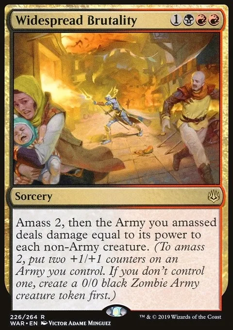 Amass Zombies 2, then the Army you amassed deals damage equal to its power to each non-Army creature. (To amass Zombies 2, put two +1/+1 counters on an Army you control. It's also a Zombie. If you don't control an Army, create a 0/0 black Zombie Army creature token first.)