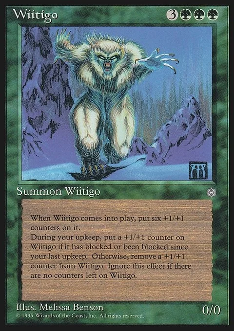 When Wiitigo comes into play, put six +1/+1 counters on it. During your upkeep, put a +1/+1 counter on Wiitigo if it has blocked or been blocked since your last upkeep. Otherwise, remove a +1/+1 counter from Wiitigo. Ignore this effect if there are no counters left on Wiitigo.