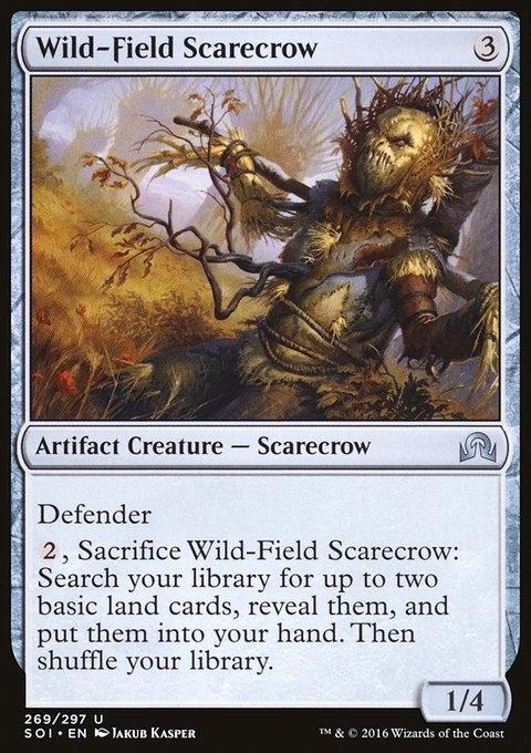 Defender {2}, Sacrifice Wild-Field Scarecrow: Search your library for up to two basic land cards, reveal them, and put them into your hand. Then shuffle your library.
