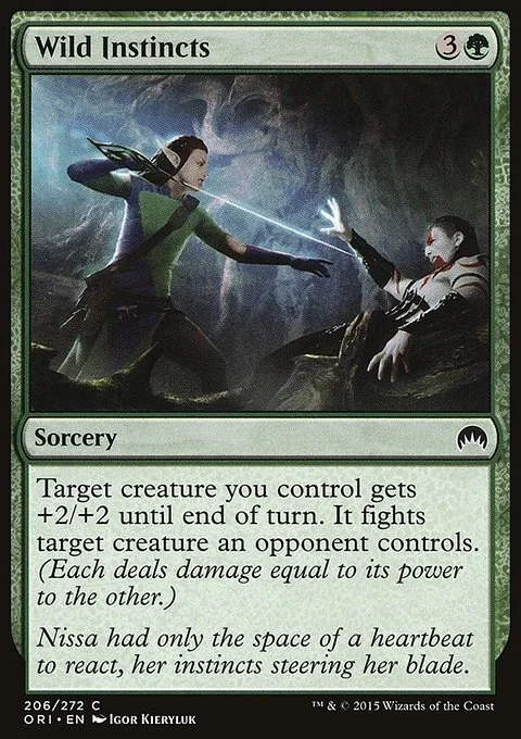 Target creature you control gets +2/+2 until end of turn. It fights target creature an opponent controls. (Each deals damage equal to its power to the other.)