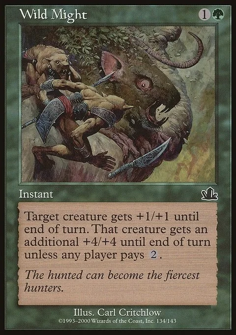 Target creature gets +1/+1 until end of turn. That creature gets an additional +4/+4 until end of turn unless any player pays {2}.