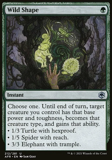 Choose one. Until end of turn, target creature you control has that base power and toughness, becomes that creature type, and gains that ability. • 1/3 Turtle with hexproof. • 1/5 Spider with reach. • 3/3 Elephant with trample.
