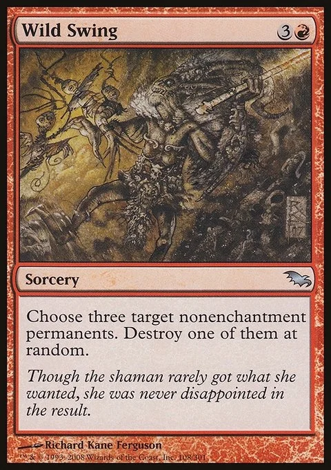 Choose three target nonenchantment permanents. Destroy one of them at random.