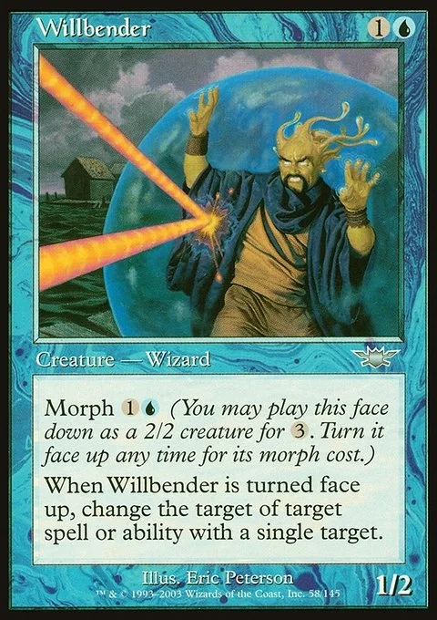 Morph 1U (You may play this face down as a 2/2 creature for 3. Turn it face up any time for its morph cost). When Willbender is turned face up, change the target of target spell or ability with a single target.