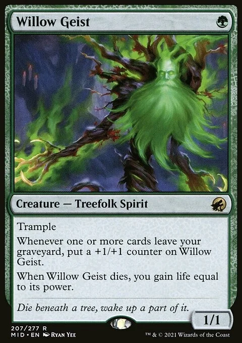 Trample Whenever one or more cards leave your graveyard, put a +1/+1 counter on Willow Geist. When Willow Geist dies, you gain life equal to its power.