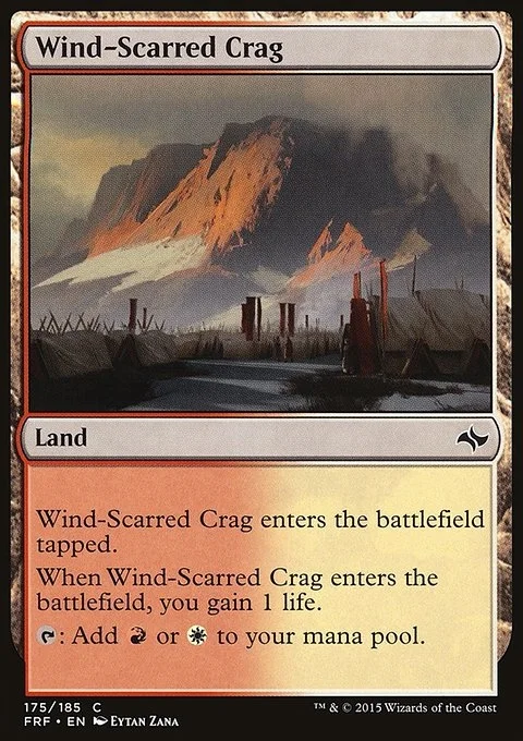 Wind-Scarred Crag enters the battlefield tapped. When Wind-Scarred Crag enters the battlefield, you gain 1 life. {T}: Add {R} or {W}.