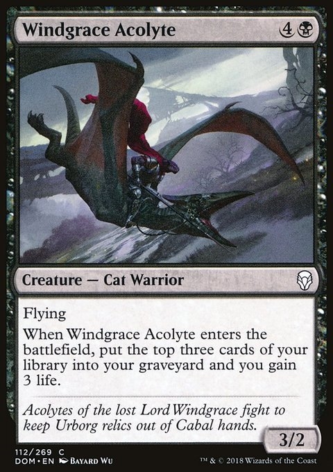 Flying When Windgrace Acolyte enters the battlefield, put the top three cards of your library into your graveyard and you gain 3 life.