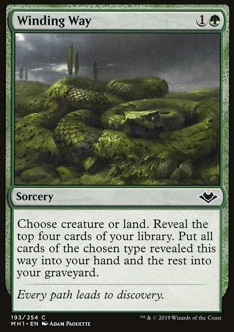 Choose creature or land. Reveal the top four cards of your library. Put all cards of the chosen type revealed this way into your hand and the rest into your graveyard.