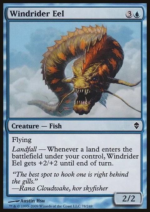 Flying Landfall — Whenever a land enters the battlefield under your control, Windrider Eel gets +2/+2 until end of turn.