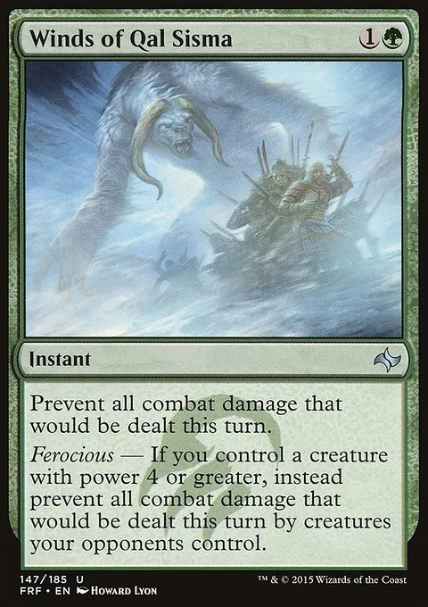 Prevent all combat damage that would be dealt this turn. Ferocious — If you control a creature with power 4 or greater, instead prevent all combat damage that would be dealt this turn by creatures your opponents control.