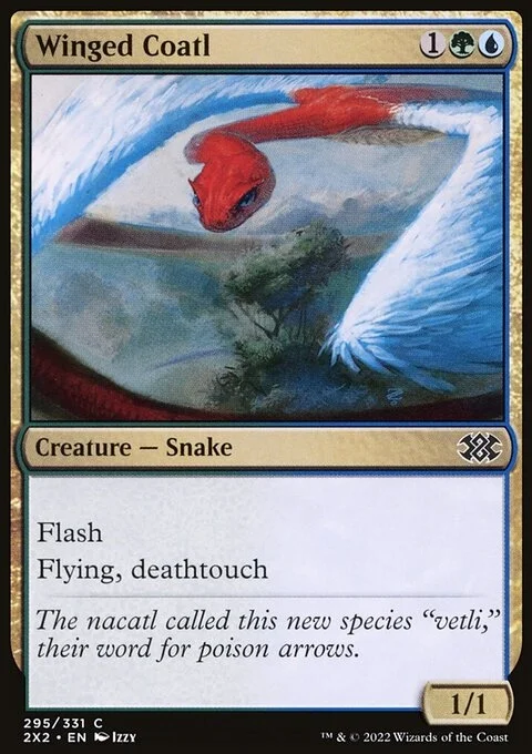 Flash (You may cast this spell any time you could cast an instant.) Flying Deathtouch (Any amount of damage this deals to a creature is enough to destroy it.)