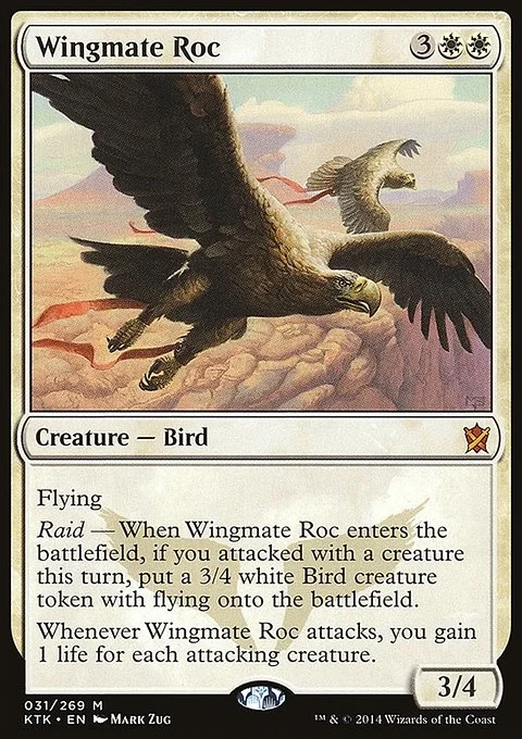 Raid - When Wingmate Roc enters the battlefield, if you attacked with a creature this turn, put a 3/4 white Bird creature token with flying onto the battlefield.