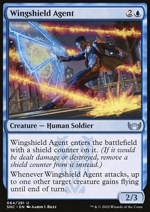 Wingshield Agent enters the battlefield with a shield counter on it. (If it would be dealt damage or destroyed, remove a shield counter from it instead.)