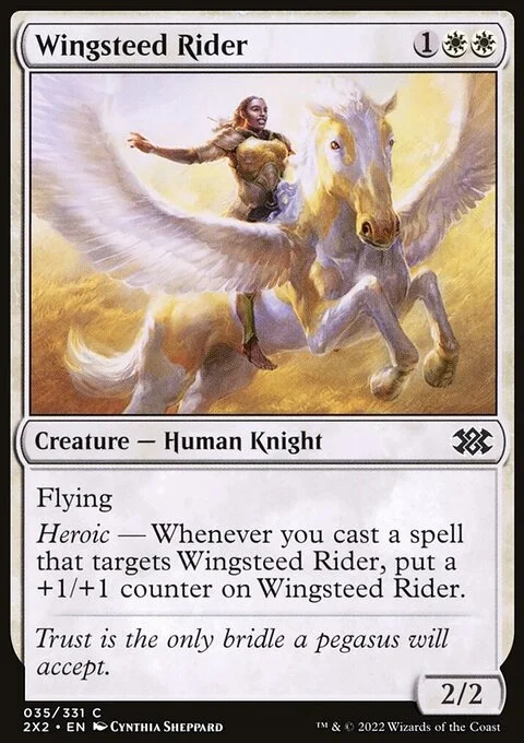 Flying Heroic — Whenever you cast a spell that targets this creature, put a +1/+1 counter on this creature.