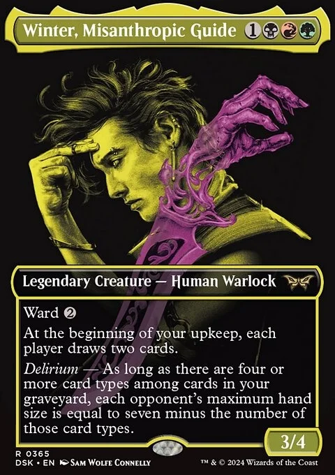 Ward {2} At the beginning of your upkeep, each player draws two cards. Delirium — As long as there are four or more card types among cards in your graveyard, each opponent's maximum hand size is equal to seven minus the number of those card types.