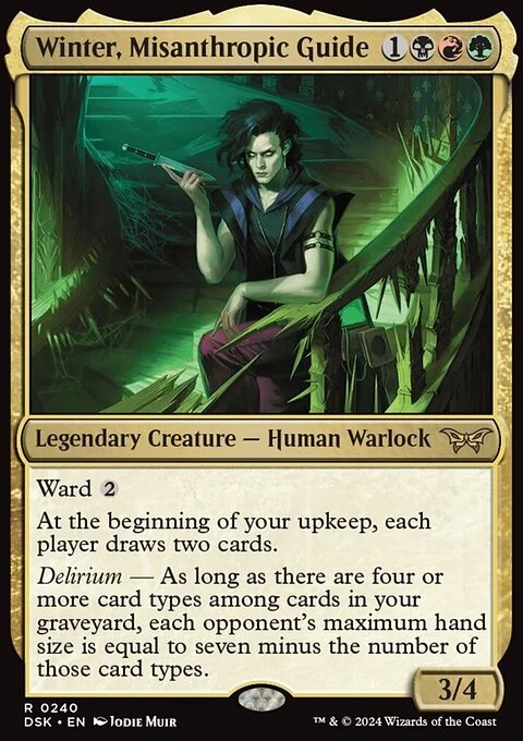 Ward {2} At the beginning of your upkeep, each player draws two cards. Delirium — As long as there are four or more card types among cards in your graveyard, each opponent's maximum hand size is equal to seven minus the number of those card types.