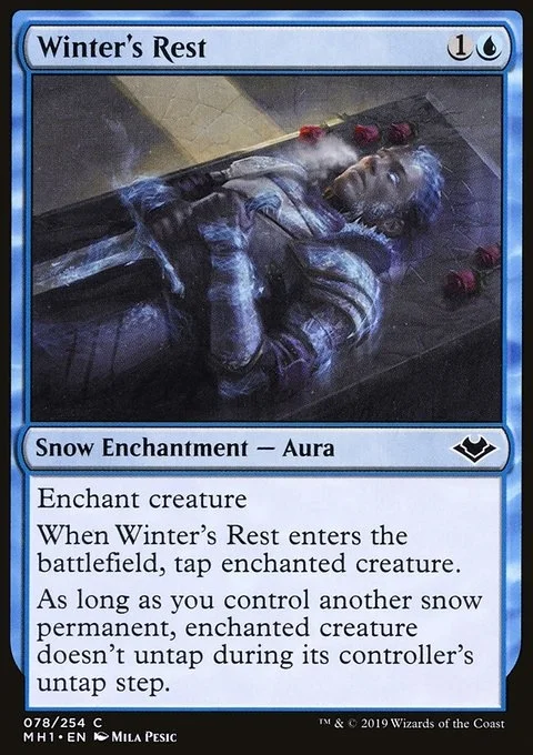 Enchant creature When this Aura enters, tap enchanted creature. As long as you control another snow permanent, enchanted creature doesn't untap during its controller's untap step.