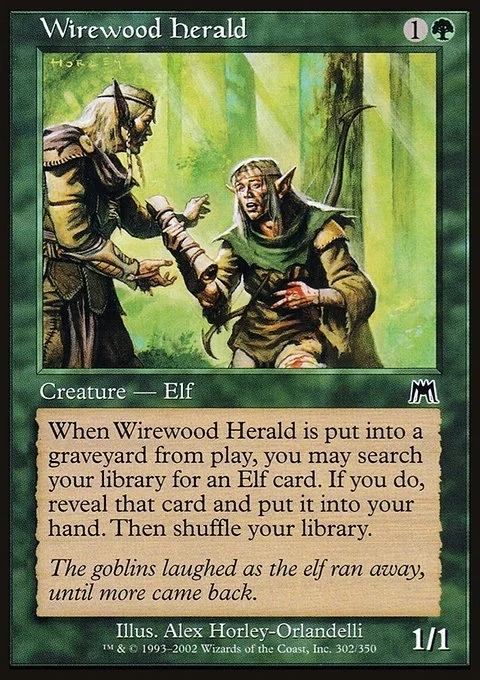 When Wirewood Herald dies, you may search your library for an Elf card, reveal that card, put it into your hand, then shuffle.